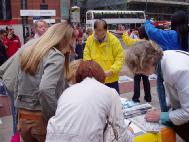 人们心里非常渴望了解真象。有一位德国人,他去过中国,并受到了中共宣传机器对法轮功造谣诋毁的欺骗和毒害。他不停的询问,围着洪法场地转了好几圈,分别和好几名学员交谈了解真象,停留了一、两个小时之久。最后,他一再叮嘱学员一定给他发更多的真象电子邮件,还拿了一些中文资料表示要交给他的朋友。