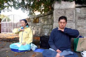![]() “法办江泽民,罗干,刘京,周永康”的横幅 | ![]() 法轮功学员在中国驻爱尔兰使馆前宣读《公告》 |