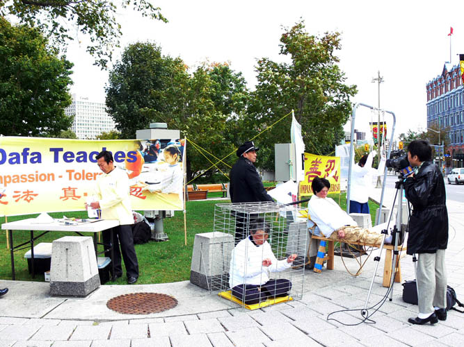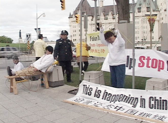 法轮功学员辛其华接受记者采访时说:这些老妈妈们在这样阴冷的天气中做酷刑展,就是希望加拿大人民和政府能够重视法轮功被中共迫害的情况。过去几年中,广东省迫害法轮功非常严重。广东省省长20日来加拿大,我们希望加拿大不让他進入。