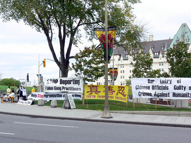本周一、周二法轮功学员连续在大风阴雨天气中,在国会山举办酷刑展要求加当局禁止黄华华入境。