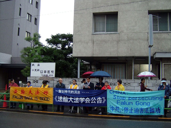上午11时许开始,学员们冒雨到中使馆对面的人行道,打出要求停止迫害法轮功的横幅,日本法轮大法学会代表卢敏和佐藤国男分别用中、日文宣读法轮大法学会公告,正告那些曾参与中共对法轮功迫害的人,抓紧时机弃恶从善,立即停止迫害,以免在对邪恶的最终审判时,断送自己美好的未来。