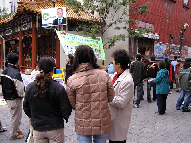 【明慧网2005年10月19日】2005年10月15日、16日,蒙特利尔法轮功学员在唐人街中山公园,为即将于10月25日至11月12日举行的“真善忍”美展進行首次大型推广活动。