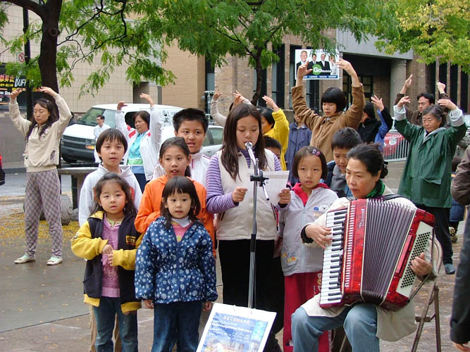 本次推广活动五个区域构成:一组是法轮功学员在炼功;一组是演示中共对法轮功学员的酷刑迫害;一组是法轮功学员的孩子在演唱歌曲;一组是赠送书签和莲花、讲真象;一组是向行人派发画展邀请卡。