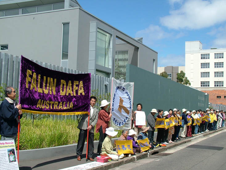 与此同时,在澳洲其它地区包括堪培拉、布里斯本、墨尔本、西澳等地的法轮功学员也向当地的中使领馆宣读和递交了公告。据悉,昆士兰法轮功学员在布里斯本中领馆前的行人道上宣读公告时,被领馆人员从屋顶上以水管向着法轮功学员们浇水。后在学员们“立即停止否则报警”的警告下停止了其流氓行径。警方在活动结束前来到了现场,学员们也向警方报告了所发生的一切。警方向学员们确认了中领馆确实在公寓里,并表示为了学员们的安全,下次有类似活动时最好告知警方,并友好的给学员们留下了他们的电话号码。