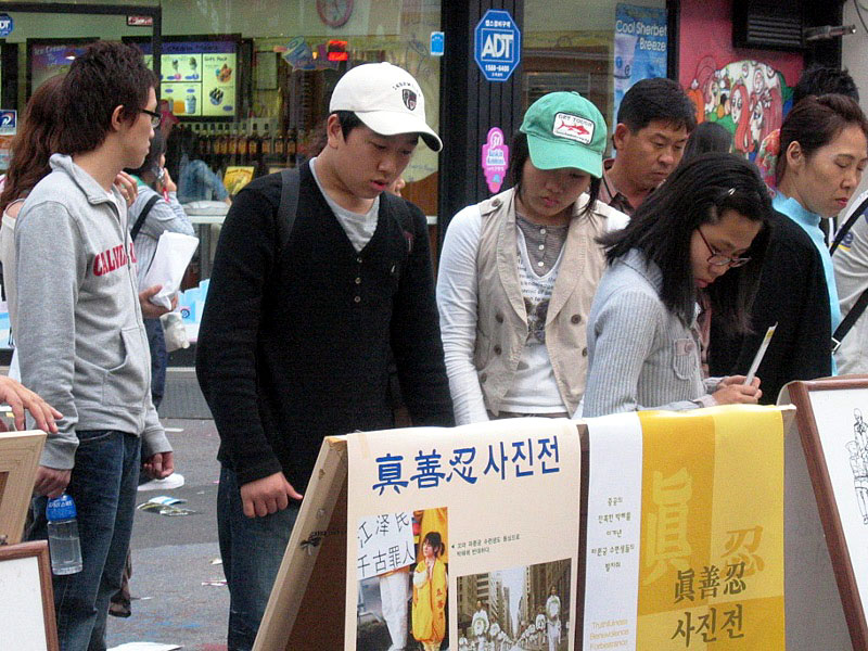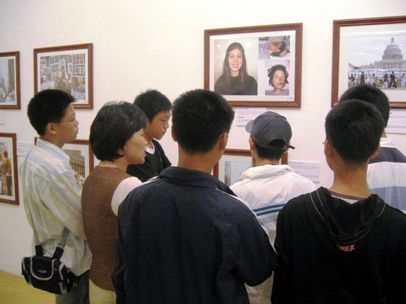 ![]() 学生观看摄影作品 | ![]() 认真听迫害真象 | ![]() 认真听迫害真象 |