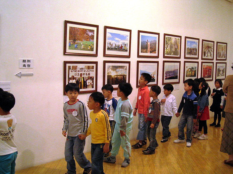 ![]() 行人观看介绍摄影展的展板 | ![]() 小学生也前来参观 | ![]() 小朋友门被大法的美好深深吸引了 |