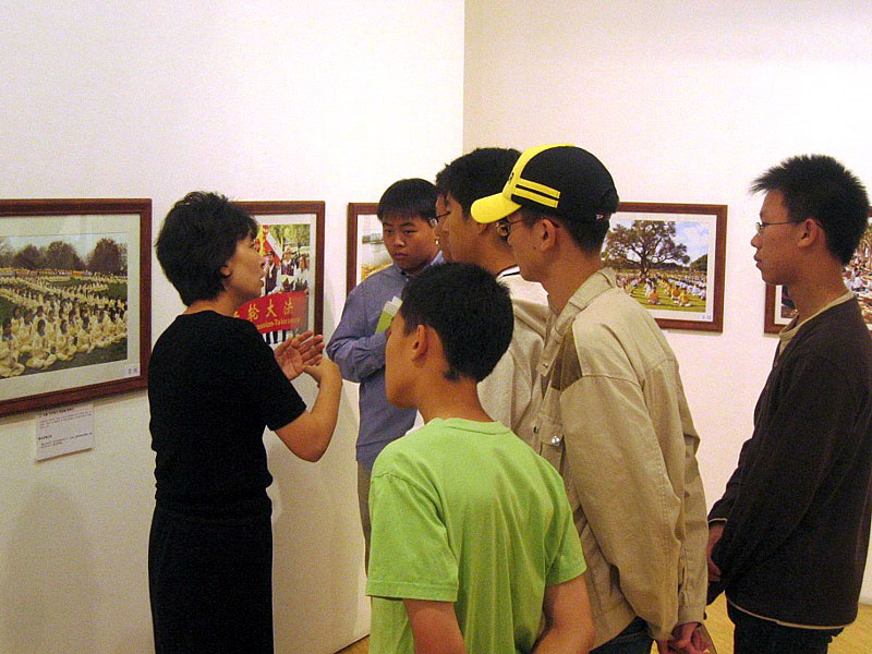 ![]() 参观者学炼功法 | ![]() 学生们听迫害真象 | ![]() 学生们听迫害真象 |