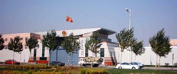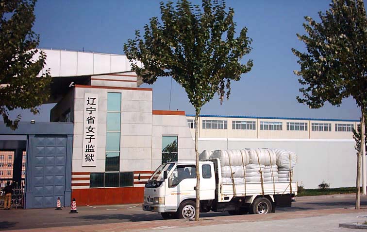 下图中显示一辆满载奴工原料的货车停在辽宁省女子监狱门前,货箱上注有“金天宇”磁振系列健康用品标识,厂家为沈阳逸生健康用品开发公司(沈阳市和平区三好街79号,电话:22948660 22947708 邮编:110004)。