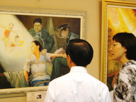 在场参观的一位游客直呼太不可思议了,在二十一世纪的现在中国大陆竟然还使用这种不人道的酷刑。还有一位老太太听到大陆法轮功儿童的状况后赶紧告诉她的老伴关于邮寄给布什总统的呼吁营救受迫害法轮功儿童的明信片。现场除了老师带小朋友进行户外教学外,亦有年轻的爸爸妈妈推着婴儿车全家一起来看画展。