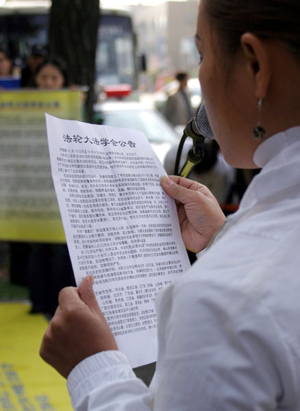 接下来,因为修炼法轮功而曾在中国被监禁的高成女朗读了“法轮大法学会公告”。她朗读到:“在这历史的关键时刻,法轮大法学会特此公告:从即日起,各省市的主要官员及中共头目如再有参与或继续迫害法轮功者,从事新的犯罪行为,一旦其离开中国大陆,将受到世界各地法轮功学员原告的刑事起诉和民事控告,追究其刑事责任,并寻求经济赔偿。”