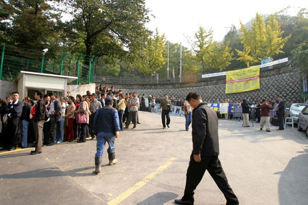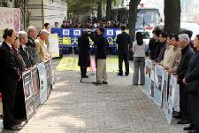![]() 在中领馆前宣读“法轮大法学会公告” | ![]() 中领馆前有许多排队等待办理领事业务的中国人 | ![]() 在釜山驻韩中领馆前宣读“法轮大法学会公告” |