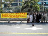 之后,“韩国法轮大法学会”代表向中国大使馆递送了公告。接着又移到中国领事馆,再次举行了活动。恰巧当天中国领事馆前有许多排队等待办理领事业务的中国人,他们目睹了活动的全过程,有些中国人仔细的阅读了印在横幅上的公告,深表关心。