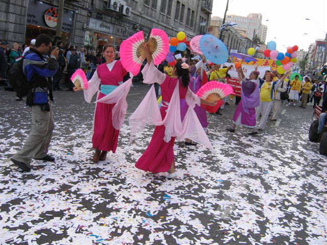 当准备好参加游行时,学员们却被游行组织者告知法轮功没有在参加游行团体的名单上。所有学员来到了公园中心最高处的一点,展开了“法轮大法好!”“世界需要真、善、忍”等横幅,舞蹈队也在音乐伴奏下开始了表演。学员们的表演吸引了所有参加游行的人,人们纷纷上前来围观并鼓掌喝彩。当舞蹈结束时,法轮功学员被邀请加入了游行队伍。