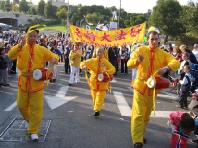 在游行队伍最前面是身穿中国传统服装、手持花伞的舞蹈队,而后是“法轮大法好”横幅和彩球队伍,后面是腰鼓队。