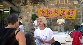 在一家饭店旁我们开始了我们的活动,有的大法弟子炼功,有的发传单,有的介绍展板,我们的出现吸引了众多的民众,很多路人停下脚步并跟着大法弟子的动作比划着炼功。很多人都认真听我们讲大法真象和在中国遭受迫害的事实。不少人在征签表上签下了自己的名字来谴责中共对法轮功学员的迫害。
