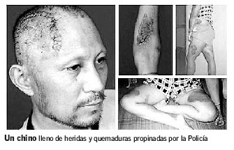 ![]() 中共警察对法轮功学员施行殴打 | ![]() 一个法轮功学员,在遭到中共警察的酷刑后满身的伤口和烧伤 |