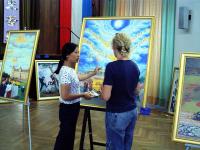 ![]() 老妇写下内心的感慨 | ![]() 年轻情侣面对画作,思索着 | ![]() 女孩们说要把画展留念带回家乡波兰和俄罗斯 |