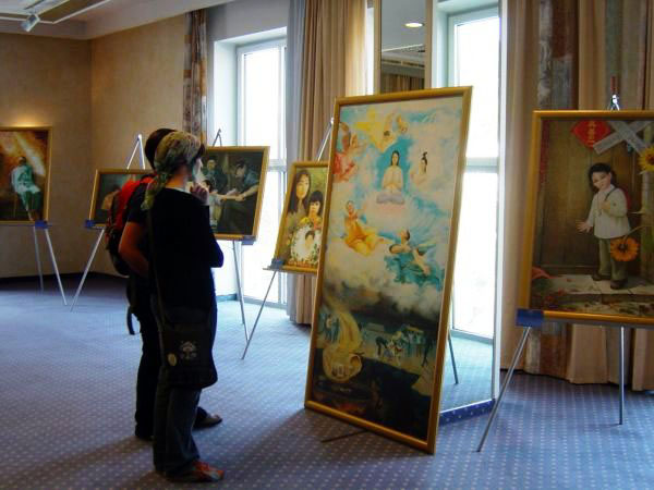 九月底的周末,真善忍国际美展在帕绍市的假日酒店 ( Holiday Inn)举办。美展给来宾留下了深刻的印象。一位艺术家接到画展介绍资料后,立即赶来参观,他说,他非常欣赏画作“天人合一”。作为艺术家,就应该表现正的,这是他努力的方向。他认为,画作“天人合一”就是一幅将艺术导向正路的佳作。