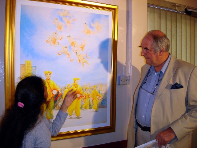 许多人前往欣赏画作,不少人请法轮功学员担任参观导览。学员除了提供详尽的介绍之外还一一解答问题。有的参观者被感动得落泪。