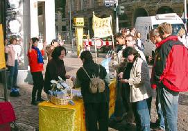 【明慧网2005年11月1日】德国法轮功学员周末来到法兰克福的一个镇子上,摆放图片,发真象资料,并面对面向当地民众讲述中共