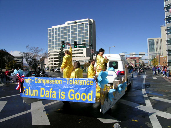 【明慧网2005年11月10日】2005年11月5日,美国科罗拉多州的法轮功学员参加了在丹佛市举行的一年一度的退伍军人节游行。当地的很多民众在这次游行中知道了法轮大法,并了解到法轮功无辜在中国受