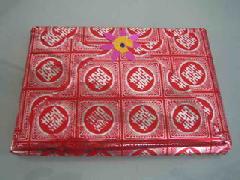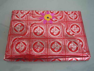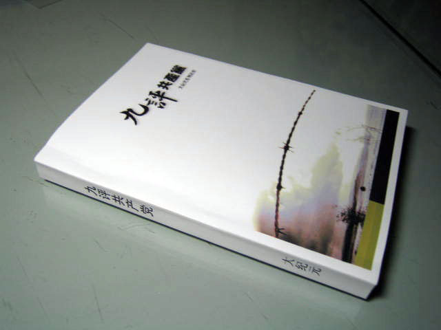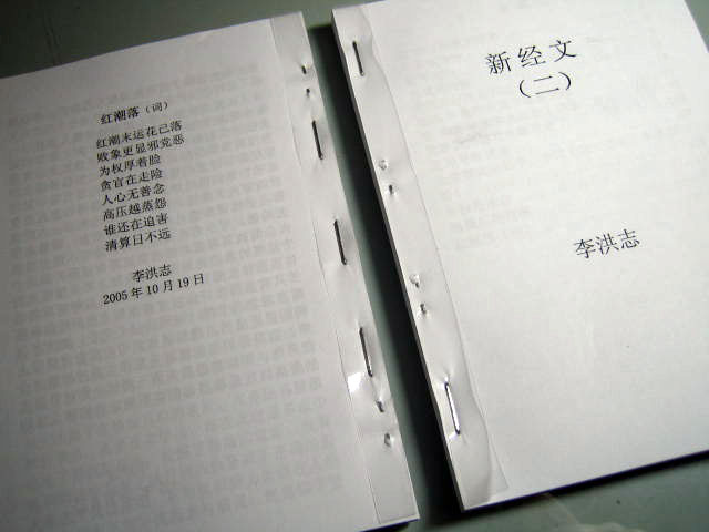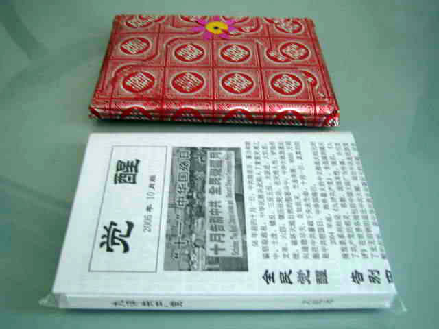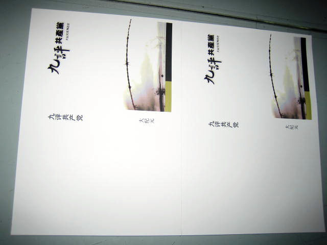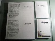 然后用彩喷纸单独制作一张彩色书皮,钉3个15号钉(前后两个正面钉,中间一个反面钉),这样书页比较牢固,不致脱落下来。先将有订的一面用切纸刀切好,用双面胶粘好书皮,再将其它三面切齐,这样制作出来的九评很精美。然后用多种颜色的包装纸裁成25×25(cm)的正方形,包進传单《觉醒》、《纵观天下》和《抹兽记》小册子,用双面胶粘好,有条件的再配上小花的饰品,如此包装的九评等效果很好。