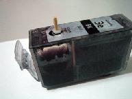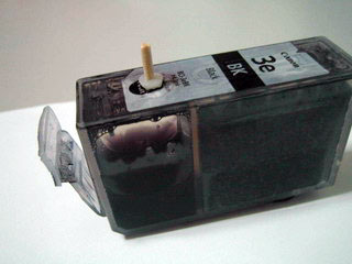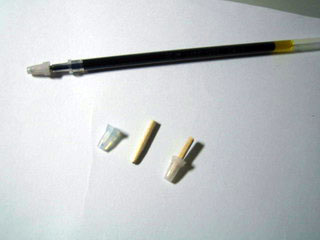 Canon墨盒是通过一个小塑料球来密封的,墨水用完后,用尖一点的堆子把塑料球抠出来,用中性笔的胶皮头来替换效果很好,插拔很方便。具体方法是:用小刀将胶皮头(种类很多,我们只用图示的那种)的大头的边缘削成坡状,用一小段牙签(剪掉一部份尖儿)插入即可。用注射器注入墨水后,用牙签串上胶皮头用力一按就行了。再次注墨时,一边轻轻摇晃牙签,一边向外拔就连同胶皮头一起拔出来了。(如图):