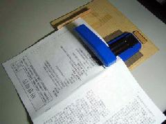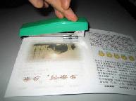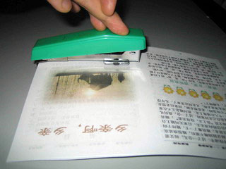 我们发现在制作厚书(包括《转法轮》)的过程中,用双面胶粘好书皮后,由于书皮较厚,书的第一页和最后一页很容易被撕带下来。我们的方法是:用A4规格的塑封膜(厚度为7S),将其裁成1厘米宽的长条(一分两开,一层即可),用固体胶轻轻粘在要装订的一侧,正反面都粘(注意固体胶只是稍微将塑封条固定在纸上,便于装订)。然后用装订机订好。粘书皮时,把双面胶粘在塑封条上,这样书皮就不会把书页撕带下来了。(如图):