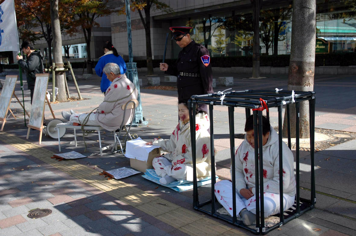 在反酷刑展中扮演被酷刑折磨的金子容子表示,她想通过这种方式向日本市民表达在21世纪的中国还发生着这样残酷的迫害,自己终于在2003年11月摆脱了在中共劳教所中受迫害的处境,活着回到日本,更感到要尽可能呼吁社会关注并帮助制止这场残酷迫害。