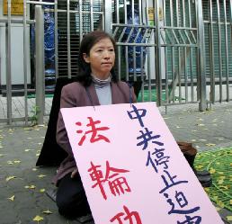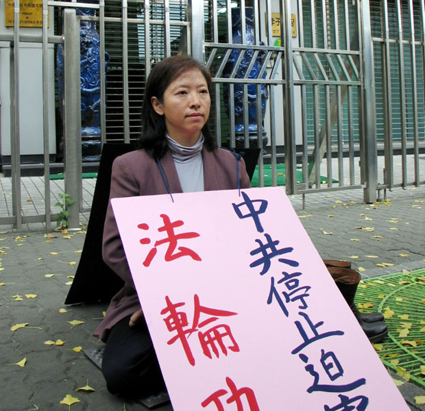 随后,她扛着抗议的夹心标语板、走进闹区,前往南山山麓的中共驻韩领事馆门前,为中国法轮功修炼者的人权遭到迫害,进行静坐抗议。