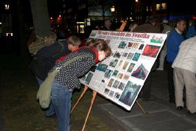 ![]() 过往路人认真阅读法轮功真象图版 |