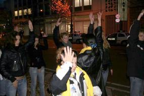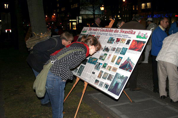 路对面走过来一群德国的青年人,他们原本一直在说笑,但当来到了学员们请愿的场地时,就安静了下来;还不约而同的也站成一排,跟着炼功音乐,模仿着学员的动作炼起功来。