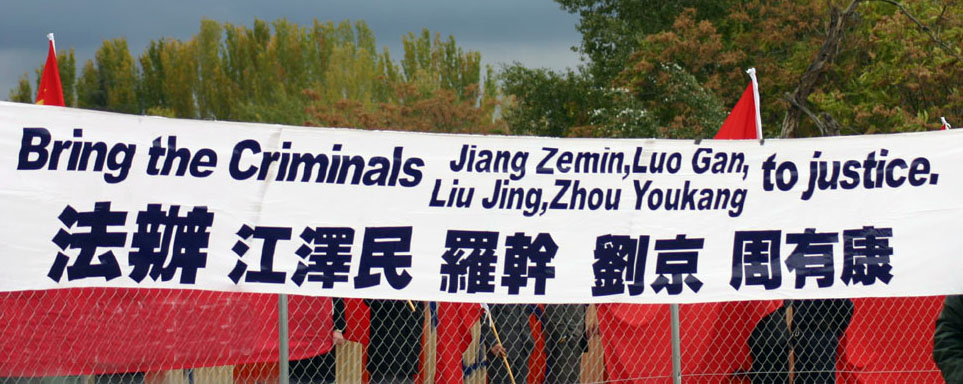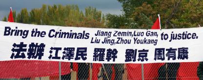 ![]() 法办江、罗、刘、周(横幅后正好是中共收买的“欢迎团”) |
