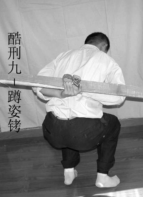 9. “蹲姿铐”:双手朝后铐住,挂在墙或高低床的某处,受刑者站不起也蹲不下,腰腿手臂酸痛。