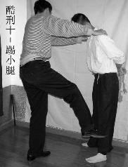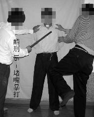 ①用力踢小腿外侧,致使受刑者走路困难。