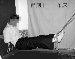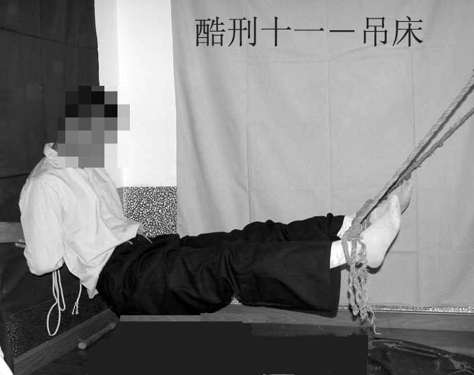 11. “吊床”:双手背铐于床头,两脚拉直绑或铐在另一张床的床头,身体离地。施刑者用脚踹床,使距离逐渐加大,使受刑者全身筋、骨节被拉开,痛不欲生(手腕、脚腕溃烂)数月后仍手脚麻木。