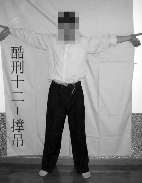 12. “撑吊”:两手伸平分别吊在身体两侧的床上或大字形连续10天,除吃饭一天一次上厕所放下来,受刑者10天不让闭眼,身体直立。放下来后,浑身酸痛,两眼青肿,看不清东西,甚至出现幻觉。