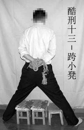 13. “跨板凳”:大法学员两脚间放2个或3个小凳子长时间站立,双腿筋肌肉酸痛。
