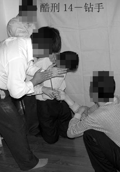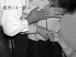 14. “筷子钻手”:大法学员两手指间夹一根筷子,一人捏紧两指,一人用双掌转动筷子。指间肉烂,再换两指间,受刑者痛彻心肺。下来后双手手指溃烂,疼痛不能抓物。溃烂处长好后,麻木感几个月后才能恢复。