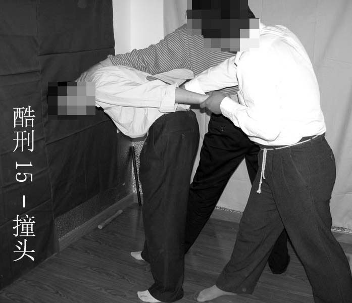 15. “撞头”:两人抓住大法学员两臂,用力往墙上撞。受刑者眼冒金星,头痛欲裂,头顶青肿,还会出现耳鸣,一个星期才慢慢恢复。