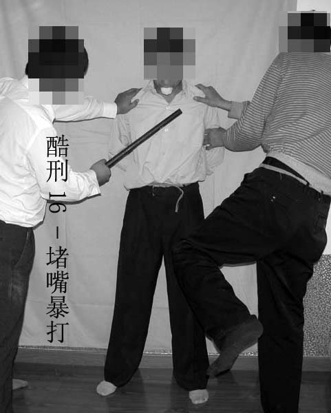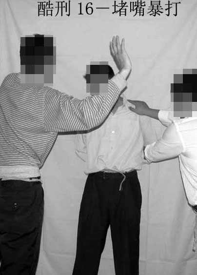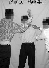 16. “堵嘴暴打”:将大法学员双手反绑于背后,嘴里用臭袜子堵住,然后任意殴打,受刑者全身青肿。