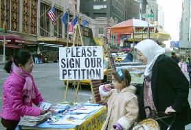 今天来往的人真多。接真象资料和签名的人也很多。有几位来自加拿大的先生,接了资料,什么也没有问就上来签字(呼吁制止迫害)。我好奇的问:以前有没有听说过法轮功?他说有。他们在加拿大经常见到法轮功学员。看来,我们的每一次讲真象都没有白做。只要他有缘走过,都会在他的生命中留下印记。总有一天,会唤醒他们。