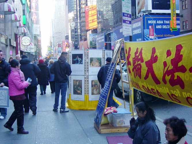 一位女同修声声的呼唤着:“这是中国正在发生的事,那里的人们正在被迫害。”她几乎是从反酷刑展一开始一直这样慈悲的呼唤到结束。她的声音很大,没有一点不好意思或害羞。每一句都震撼着我的心灵。我人的观念在她的慈悲呼唤下层层脱落。我相信,过往的人们也感受到了她的发自心底的慈悲。接她的传单的人很多。