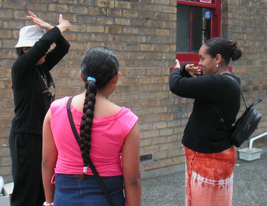 照片上穿红裙子学功的妇女,她告诉学员她是埃塞俄比亚在新西兰的难民,她是陪学习的女儿到社区来的。她女儿没有下课时她就在女儿二楼课室门口,隔着玻璃墙,向外面炼功的学员,默默的模仿学功。女儿下课后她马上领着女儿来到摄影展,听学员讲解摄影展的内容,又认真的向学员学功。