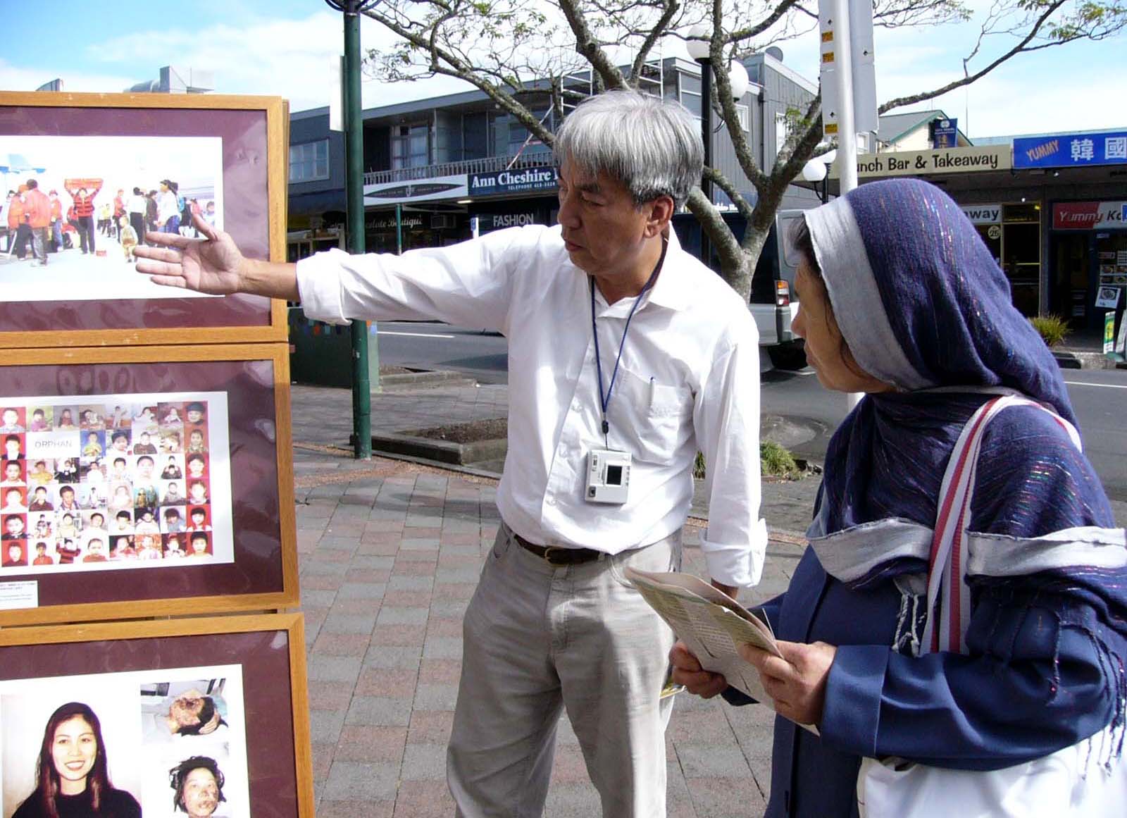 照片上穿黑色外套的年轻妇女,是从中国技术移民来新西兰的,她问学员:他们(中共)说你们一天到晚就干这个(讲真象、炼功)不干别的。学员耐心告诉她,我们有的在国内已工作几十年了,是因为中共邪恶的迫害,被迫背井离乡的。有的是利用自己休息时间,自己出钱制作摄影展和资料的,目地想告诉所有人,中共现在还在继续疯狂的迫害法轮功这群最善良、信仰“真、善、忍”的修炼人,希望你明白后告诉你的亲朋好友法轮大法好。学员还告诉她《九评共产党》的出现,就是要人们认清共产党的真实本质,是它坏事做多了,天要灭它的。这位女士知道真象后主动说,我要看你们现有的资料,我回家也要看明慧网,我一定会看《九评共产党》,我会爱惜你们给我的资料,我要了解你们。我还要告诉我的父母这一切,因为他们都是老共产党员了。