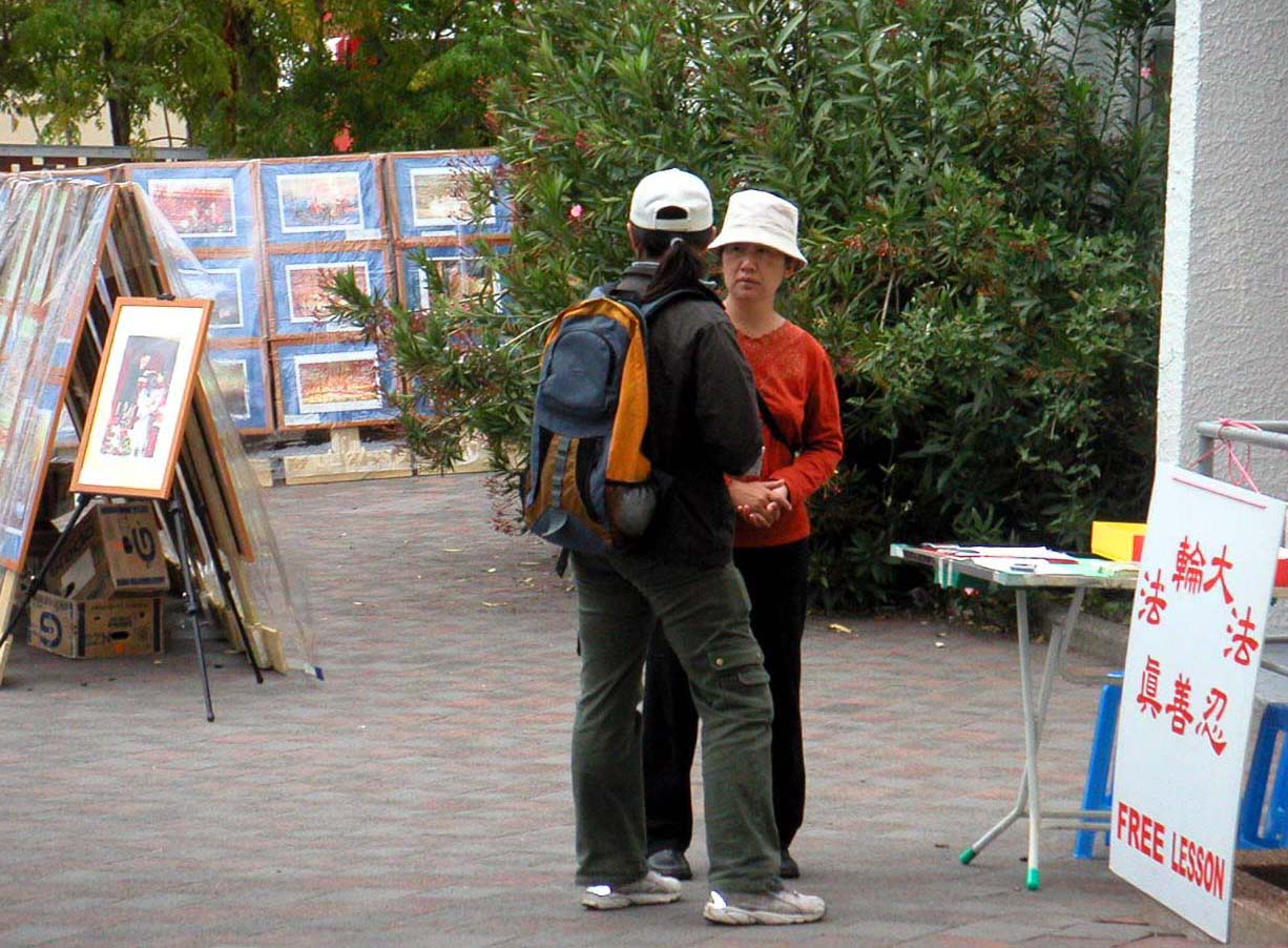 还有一位退休老人,看上去在中国国内是有一定职务的,看过展览后和学员聊了近一个钟头,老人从不理解,到提问题,学员都耐心的向他讲法轮大法好,解答他提的问题。最后他评价学员说,你们懂得真多,让我了解了许多法轮功真象,你们下次再来吧,我到时还会来的。