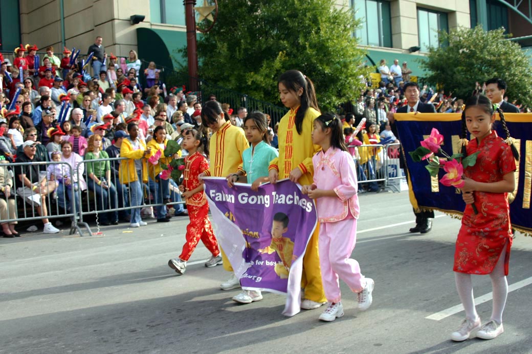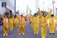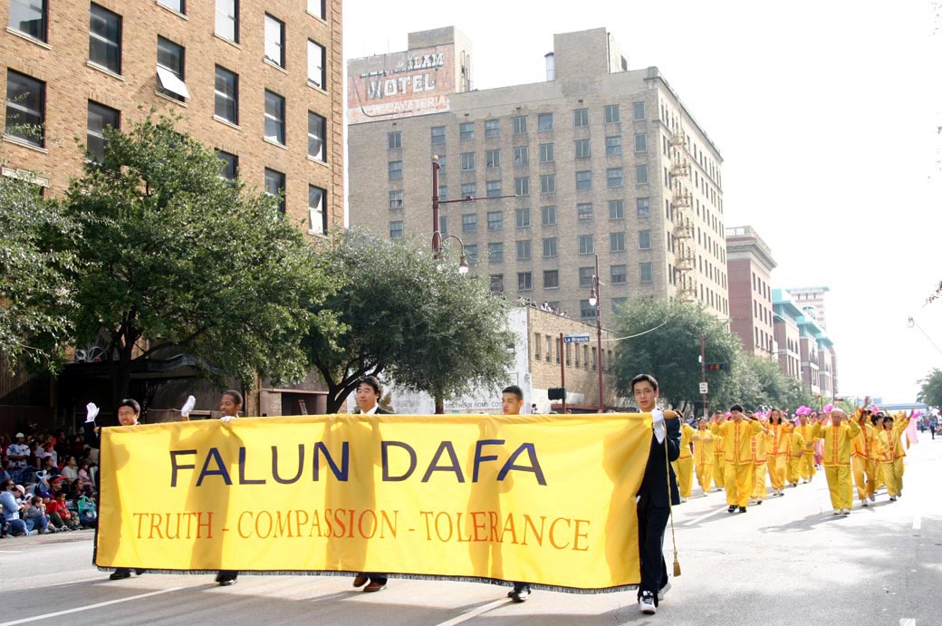 由休士顿的法轮功学员、与来自周边城市的部份学员一起组成的百余人数的队伍:前面是“真 善 忍”圆匾,之后是英文字体的“法轮大法─真 善 忍”横幅,随后是炼功队、唐装舞、腰鼓队、唐鼓队、明慧学校小弟子、及“法轮大法”横幅。