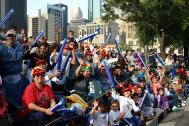一些观众用中文对学员说:“你好!”更多的观众以掌声表达对法轮功队伍的心声。