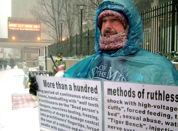 法轮功学员在天寒地冻的大风雪中依然站在曼哈顿大街上讲真象。这张照片将地点环境交代得很清楚。照片运用了近大远小的大对比形式,突出主体,而以背景中酷刑展示的人物陪衬主体事件内容。