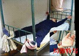 此种酷刑即是将学员扣在铁床边横棱上,腰和臂部硬塞至床下。遭受此刑者非常痛苦,严重者腰部受伤,不能直立。